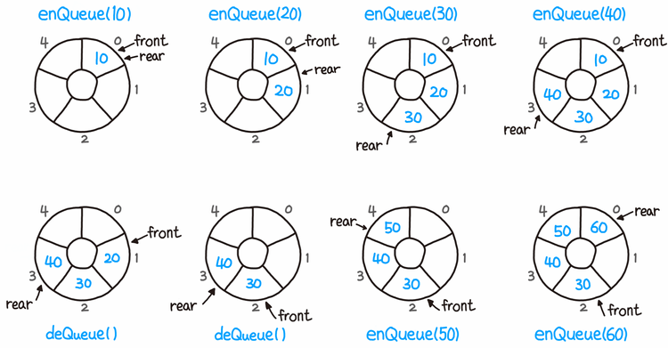 Queue를 위해 배열을 지정하고 Queue를 사용하다 보면 배열의 앞부분이 빈다는 점을 활용하여 배열의 맨 마지막 부분을 쓰면 다시 맨 처음부터 다시 Queue를 채우기 시작하는 형태의 Queue입니다.