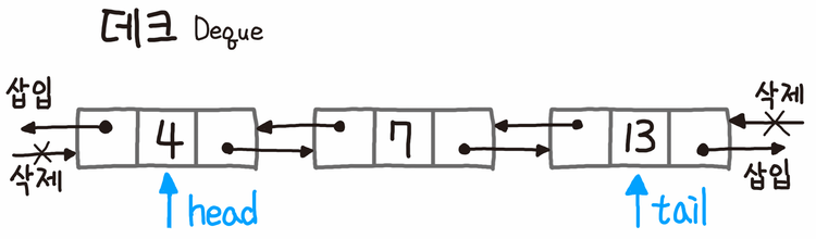 일반적인 큐는 뒤에서만 입력이 이루어지고 앞에서만 출력이 가능한 데 비해, 데크는 양쪽에서 모두 입력/출력이 가능한 스택( Stack )과 큐( Queue )의 특징을 모두 갖고 있습니다.