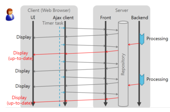 웹 클라이언트에서 일정 주기마다 서버에 요청을 보내고 서버는 현재 상태를 바로 응답하는 방식입니다.