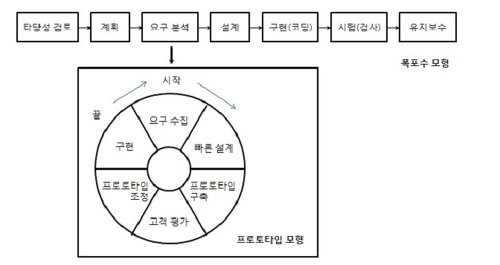 요구사항을 정확히 파악하기 위해 소프트웨어의 견본품( Prototype )을 만들어 결과물을 예측하는 모형이다.