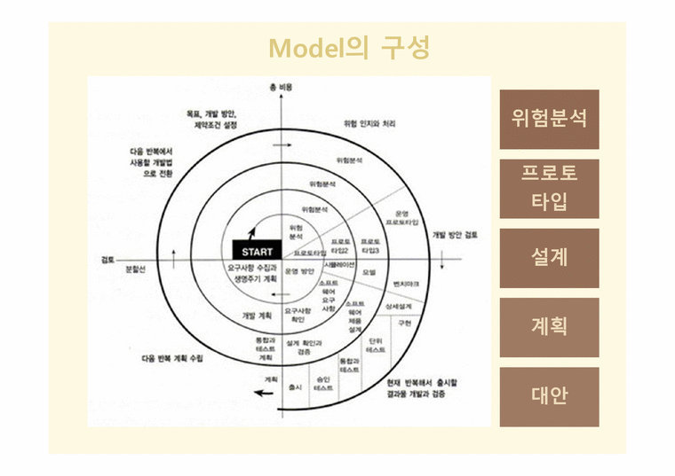 Waterfall 모형의 장점 + Prototype 모형의 장점+ 위험 분석 기능