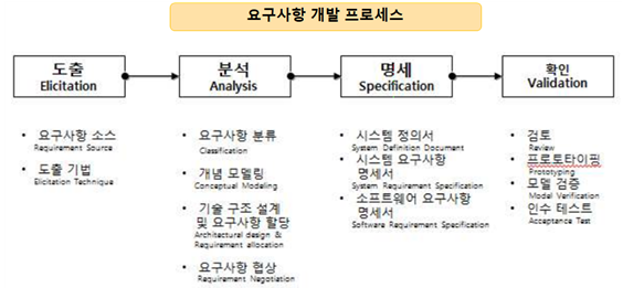 요구사항 도출 ->요구사항 분석 ->요구사항 명세 ->요구사항 확인