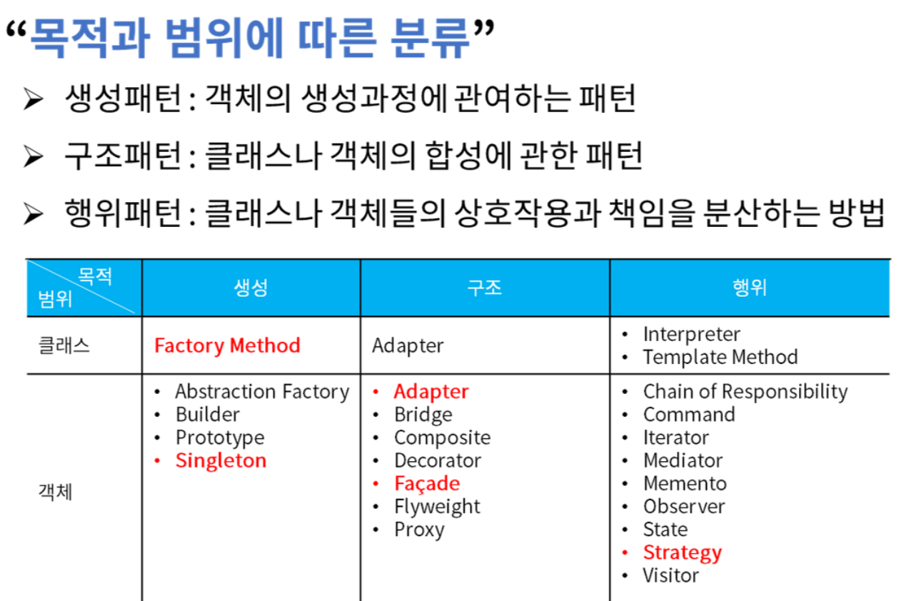 GoF의 디자인 패턴은 유형에 따라 생성 패턴( 5개, 위 그림에서는 4개 ), 구조 패턴 ( 7개 ), 행위 패턴 ( 11개 )로 구성되어있습니다.