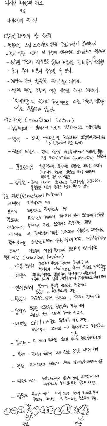 디자인 패턴은 각 모듈의 세분화된 역할이나 모듈 간의 인터페이스와 같은 코드를 작성하는 수준의 세부적인 구현 방안을 설계할 때 참조할 수 있는 전형적인 해결 방식 또는 예제를 의미한다.