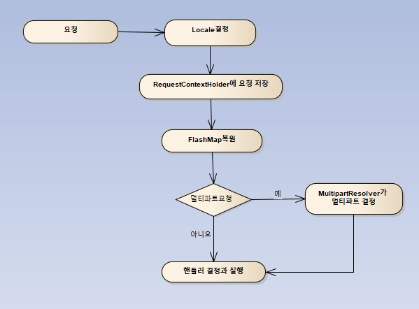 최초에 Dispatcher Servlet에 요청이 들어오면 바로 Handler를 찾고 실행하는 것이 아닌 몇 가지 선행 처리 작업을 실행합니다.